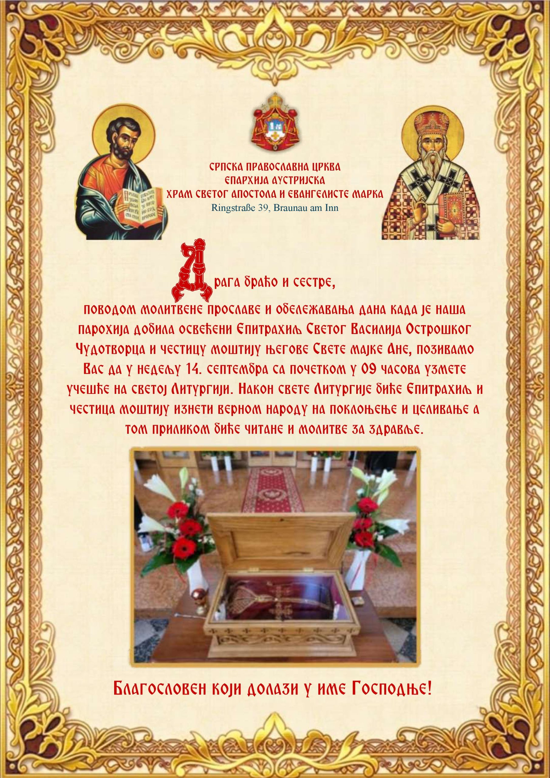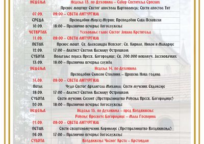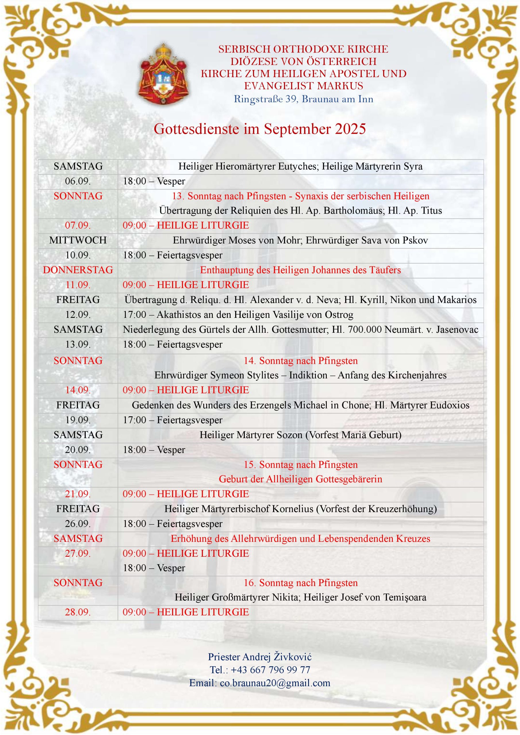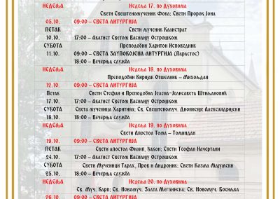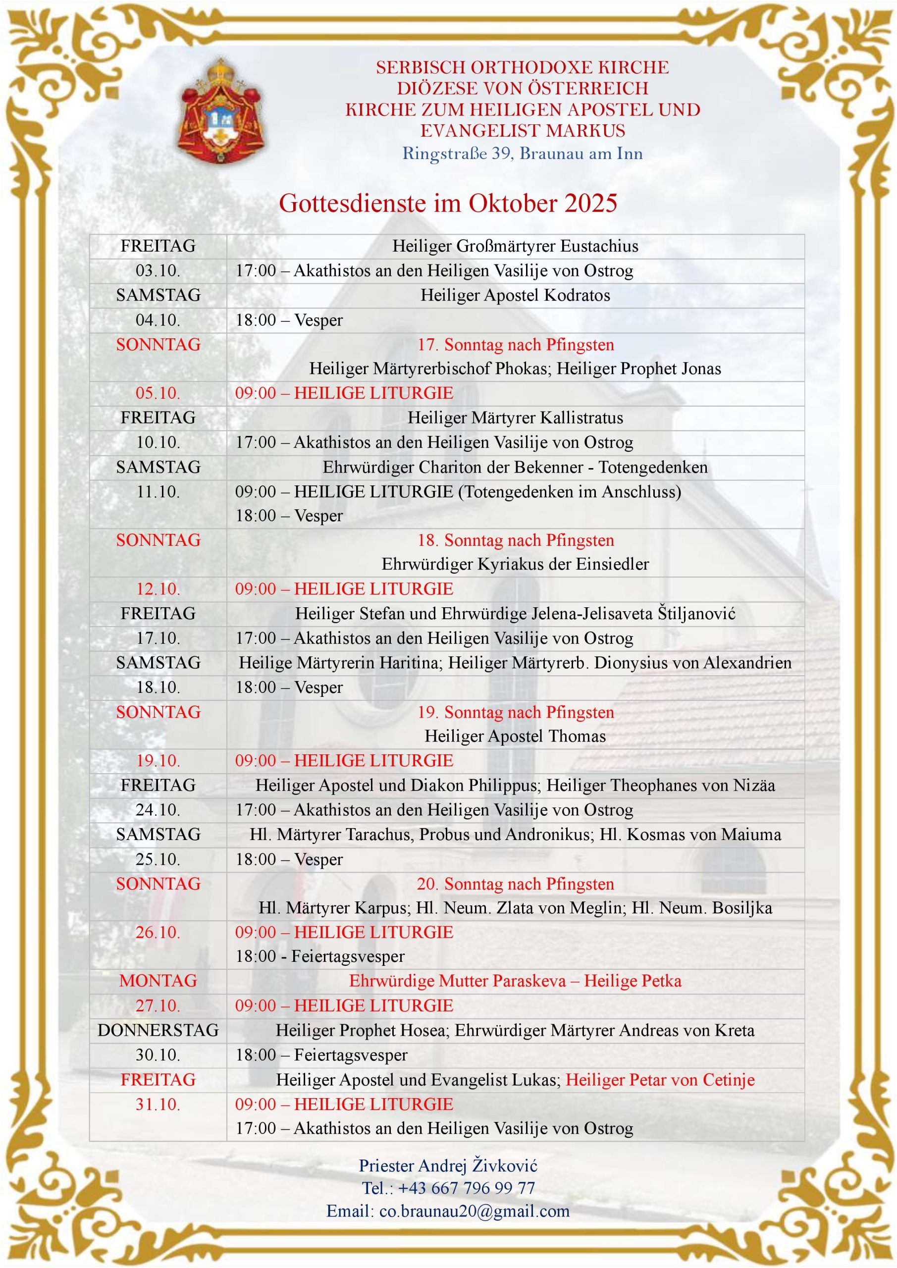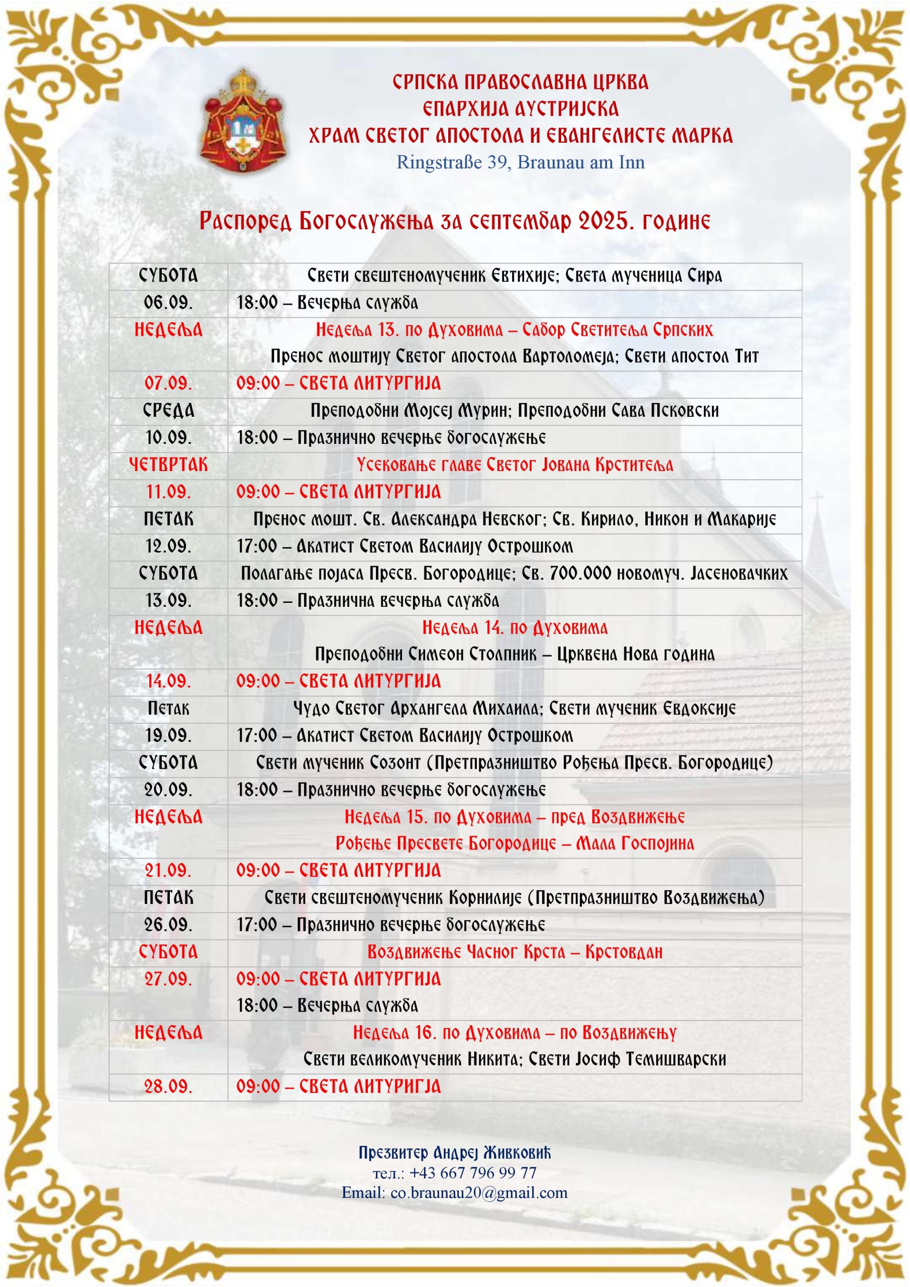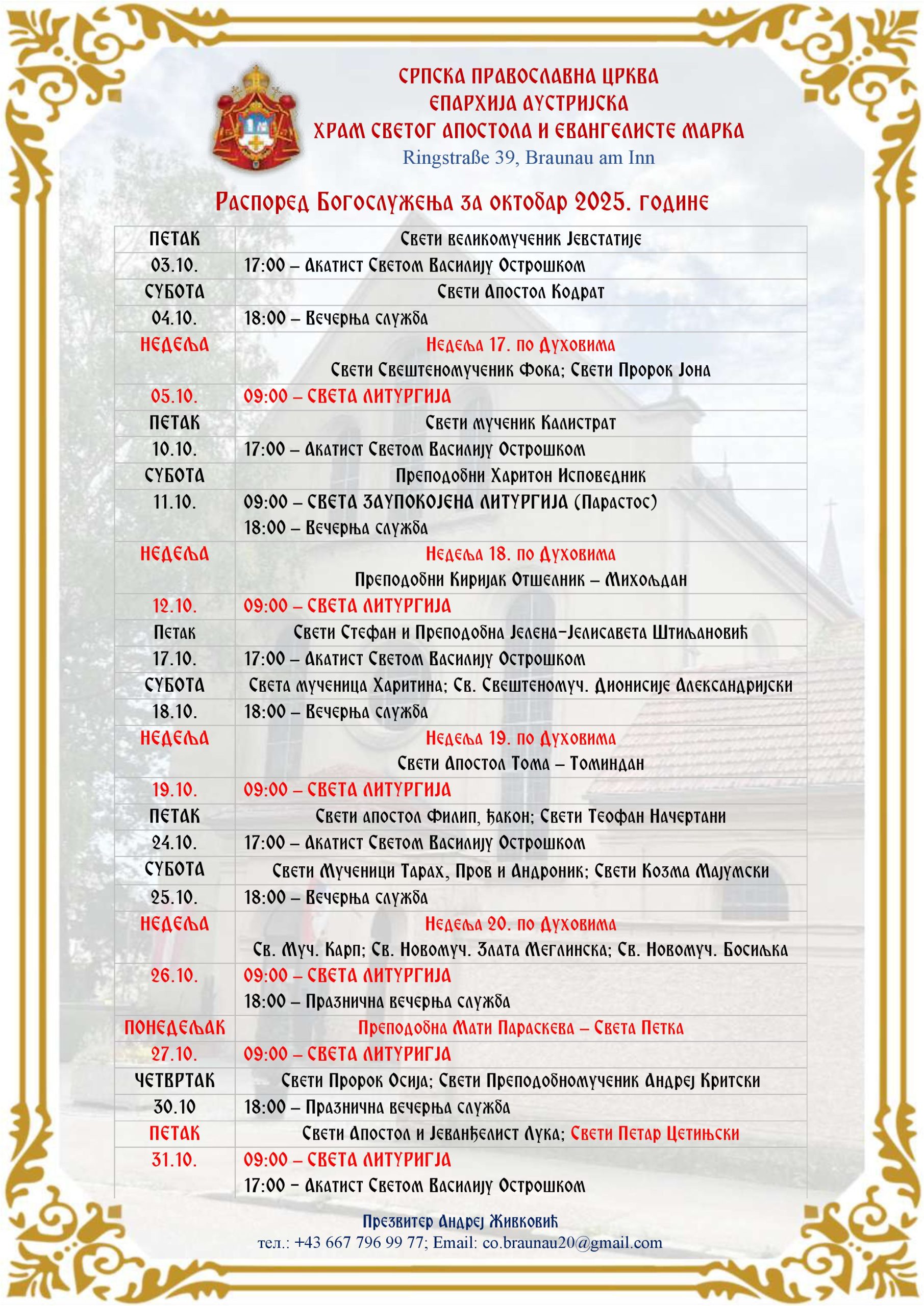 Храм Светог апостола и јеванђелисте Марка Распоред богослужења Распоред за октобар 2025. Најаве за септембар 2025. Распоред за септембар 2025. Распоред за август 2025. Распоред за јул 2025. Распоред за јун 2025. Распоред за мај 2025. Распоред за Васкрс 2025. Распоред за април 2025. Васкршња радионица Света тајна Јелеосвећења Распоред за март 2025. Распоред за фебруар 2025. Распоред за другу половину јануара 2025. Распоред за Божић 2025. Распоред за прву половину јануара 2025.