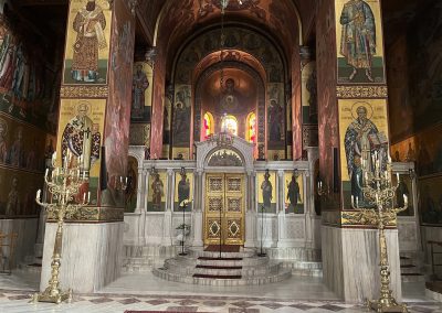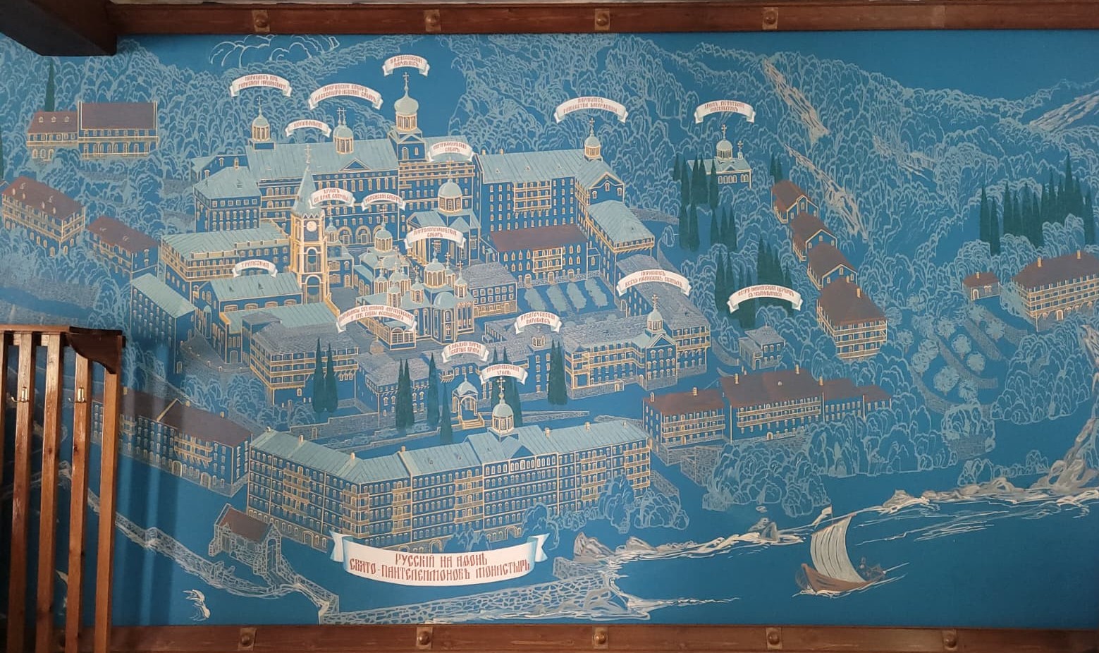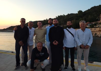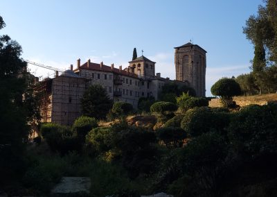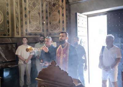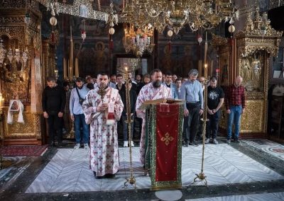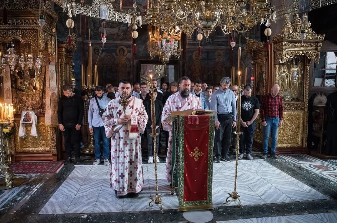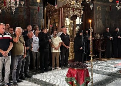 У току вечери, имали су прилику да молитвено учествују на свеноћном бденију уочи празника Преображења Господњег, као и на светој Литургији на којој је саслуживао о. Андреј Живковић. Након свете Литургије, поклонивши се чудотворној икони Пресвете Богородице Тројеручице, ова група поклоника наставља свој пут ка светогорском манастиру Св. Пантелејмона који се налази на југозападу Свете Горе, између пристаништа Дафни и манастира Ксенофонта.